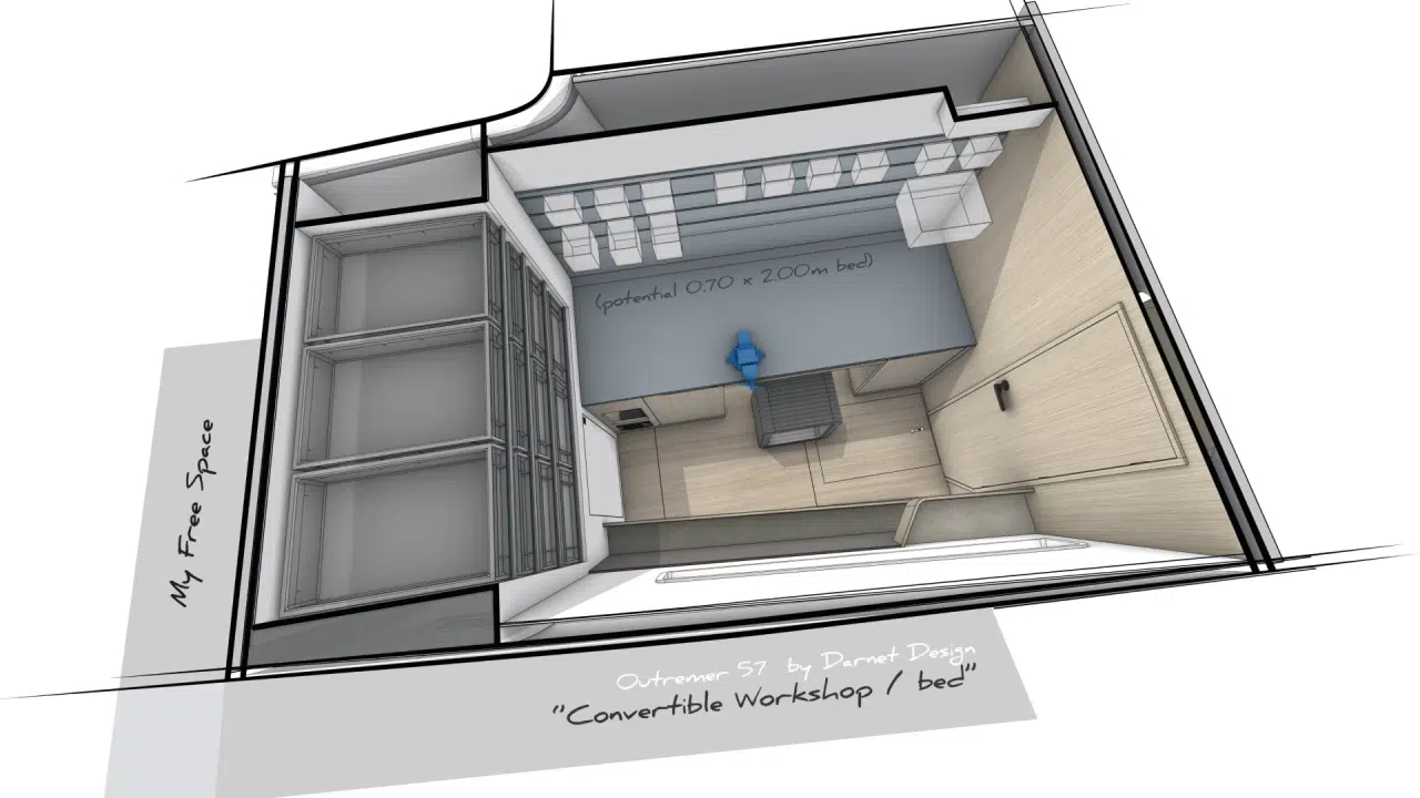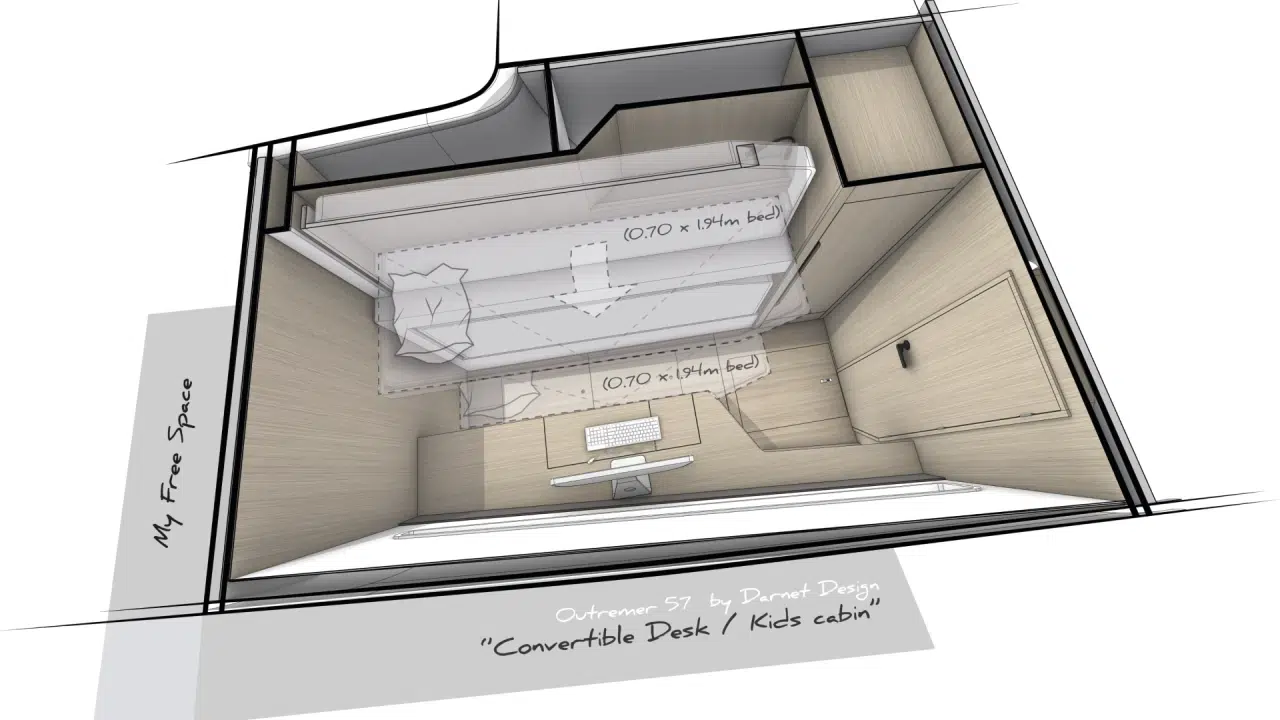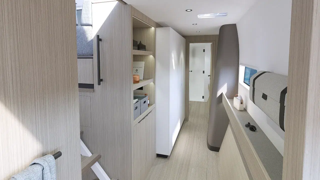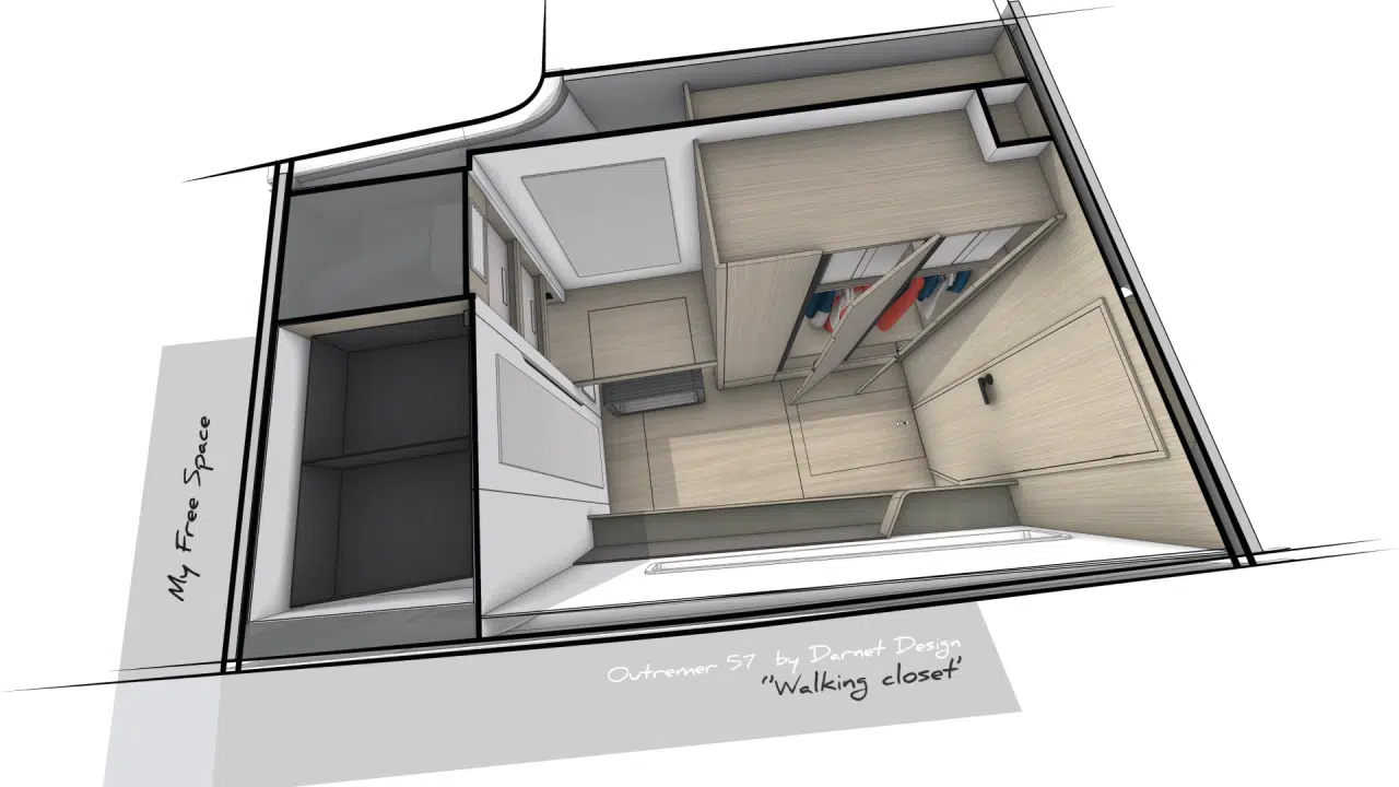 Der Outremer 57 wurde für das echte Leben auf See entwickelt und bietet viel Platz für einen langen Aufenthalt: natürlich integrierte Stauräume, leicht zugängliche Technikbereiche und eine Ladekapazität, die es Ihnen ermöglicht, alles mitzunehmen, was Sie für eine lange Reise benötigen. An Bord können Sie mit einem einzigen Schritt zwischen Salon und Cockpit wechseln, dank der Öffnungen an der Front und an den Seiten zirkuliert die Luft, und die zentrale Insel und die Kombüse wurden neu gestaltet, um dem Leben auf See und vor Anker gerecht zu werden. Dieser ganzheitliche Ansatz schafft ein Boot, das autarker, komfortabler und vor allem im Alltag leichter zu bewohnen ist.