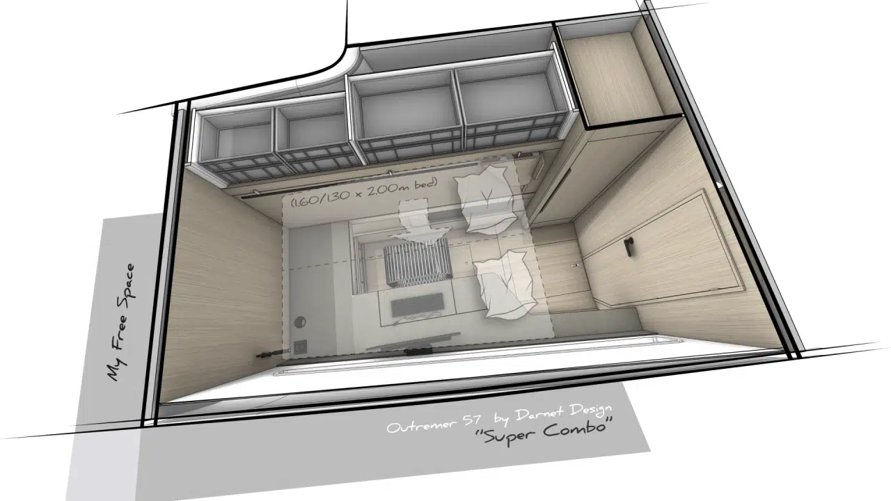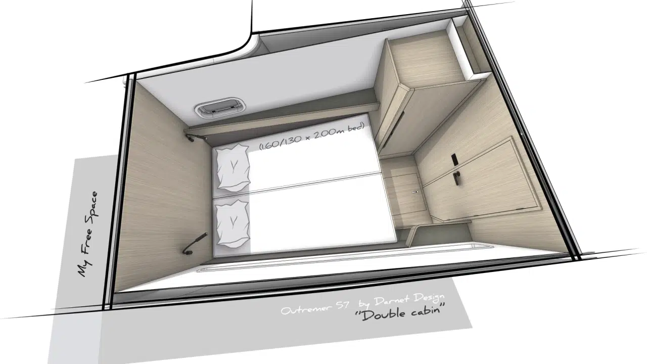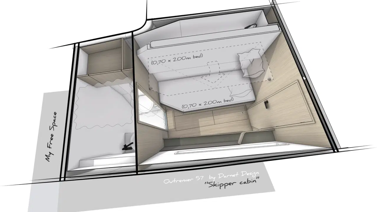 Mit seinen Auslegern, seinem kontrollierten Gewicht und einem effizienten Segelplan, den sie von der 55 übernommen hat, hält der Outremer 57 auch bei voller Beladung für große Kreuzfahrten hohe Tagesdurchschnittsgeschwindigkeiten. Sie bietet ein ruhiges, stabiles und sicheres Fahrverhalten auf See und behält dabei die Reaktionsfreudigkeit und Wendigkeit, für die Outremer bekannt ist. Jedes Manöver kann unter allen Bedingungen sicher vom Cockpit aus durchgeführt werden, sodass Sie wirklich mit einer kleinen Crew segeln können: ein großer Vorteil für Hochseesegler!