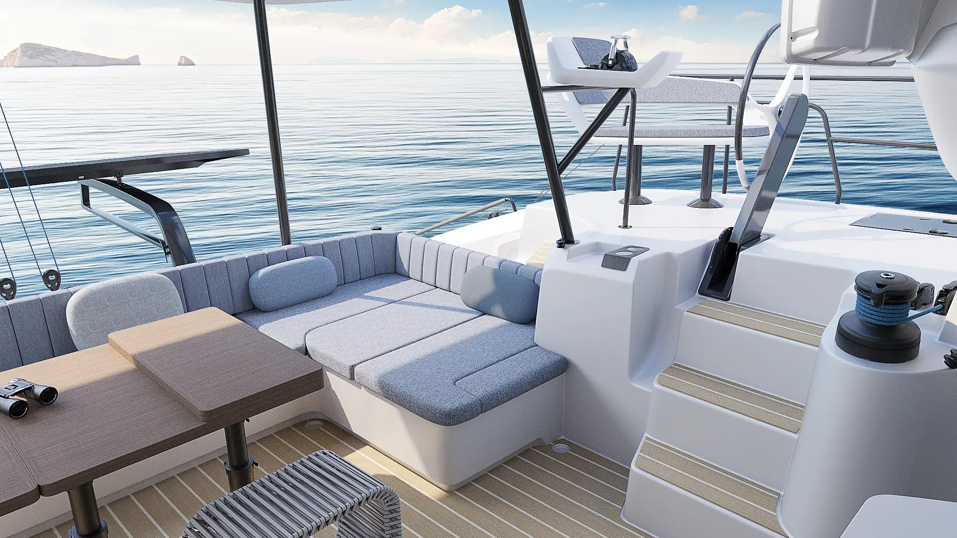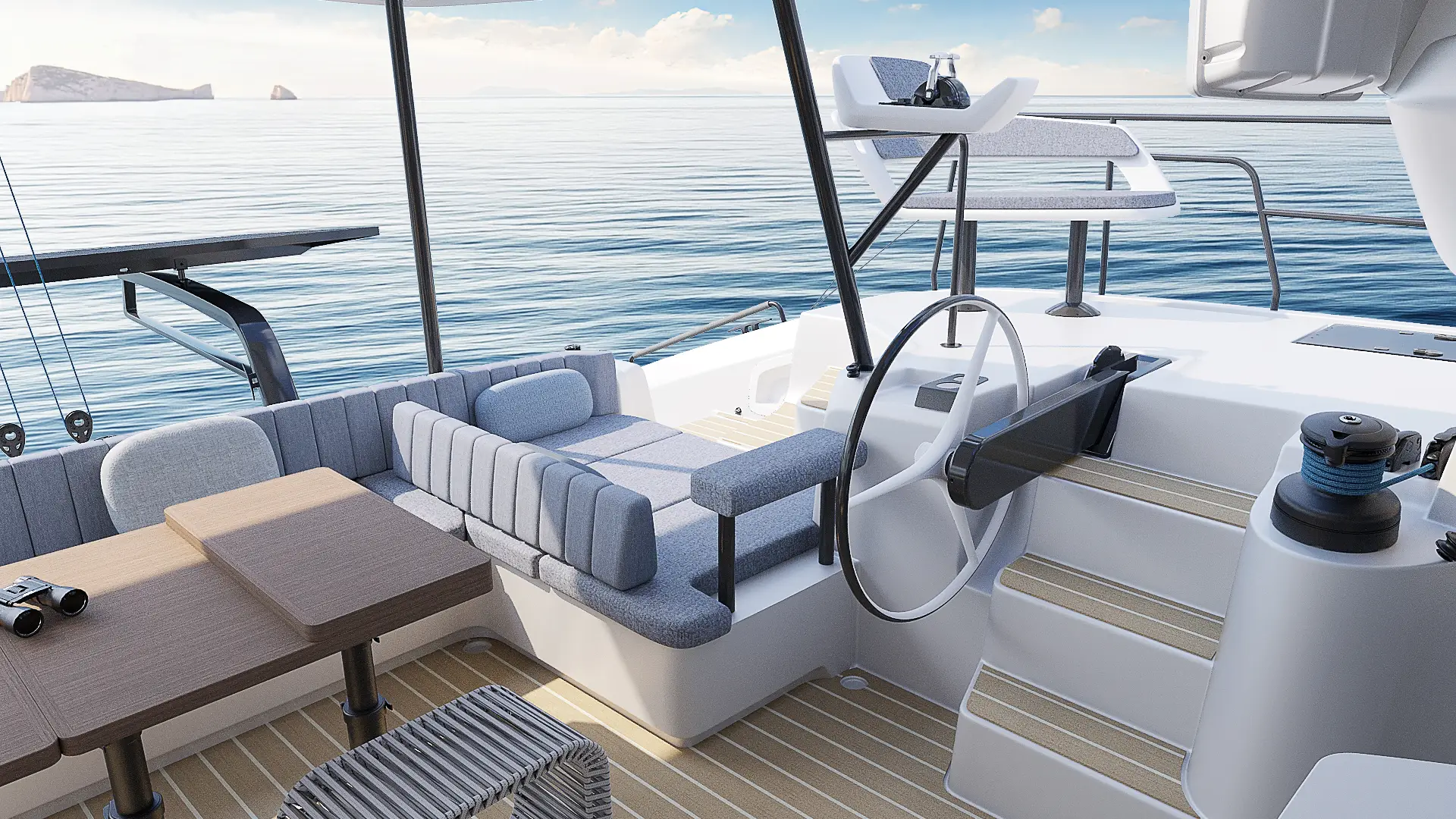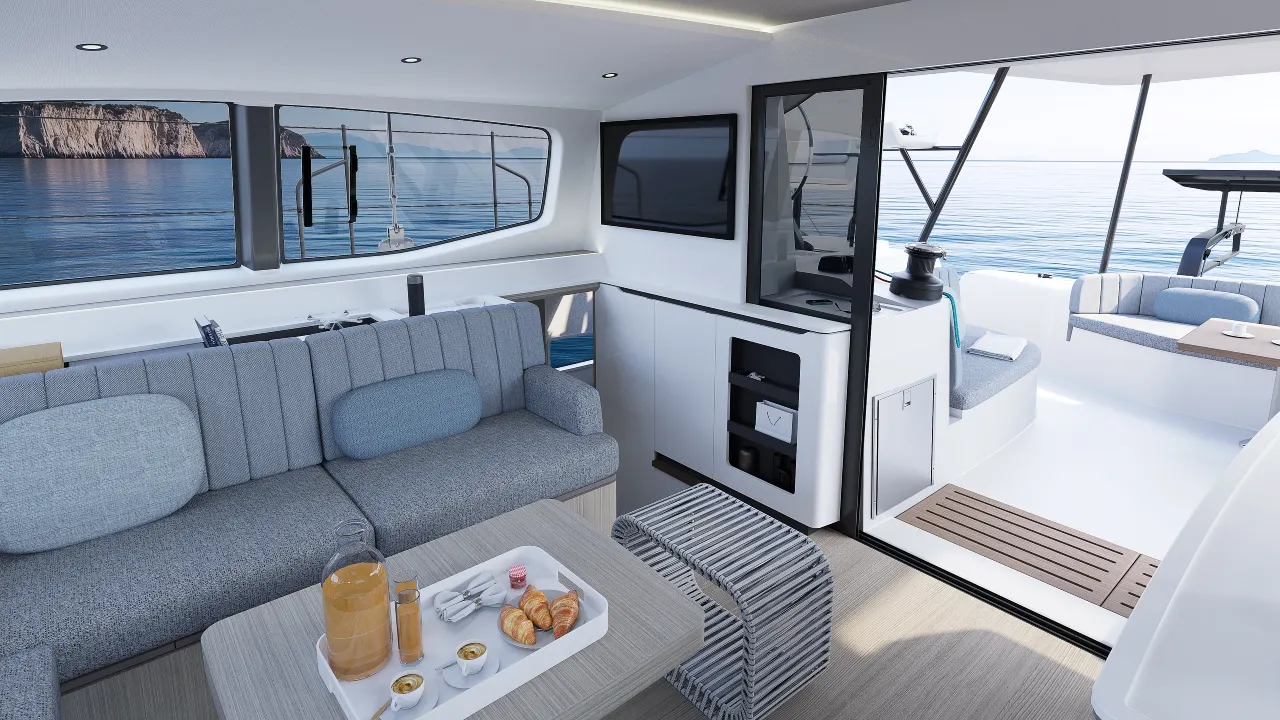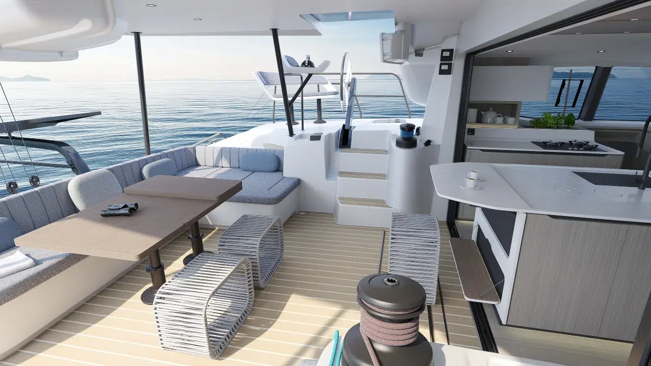 Der Outremer 57 wurde vom Outremer 55 übernommen und durch tausende von Meilen Feedback verbessert und bietet vorbildliche Segelsicherheit. Sein L-förmiges Cockpit, die zentralisierten Steuerungen, die starre Monoblock-Struktur und die verstärkten Achterbalkone schaffen eine stabile und intuitive Umgebung, selbst unter schwierigen Bedingungen. Panoramische Sicht, geschützter Bewegungsraum und einfache Handhabung machen den Outremer 57 zu einem Katamaran, der für lange, problemlose Überfahrten konzipiert ist, egal ob mit einer kleinen Crew oder mit der Familie.
