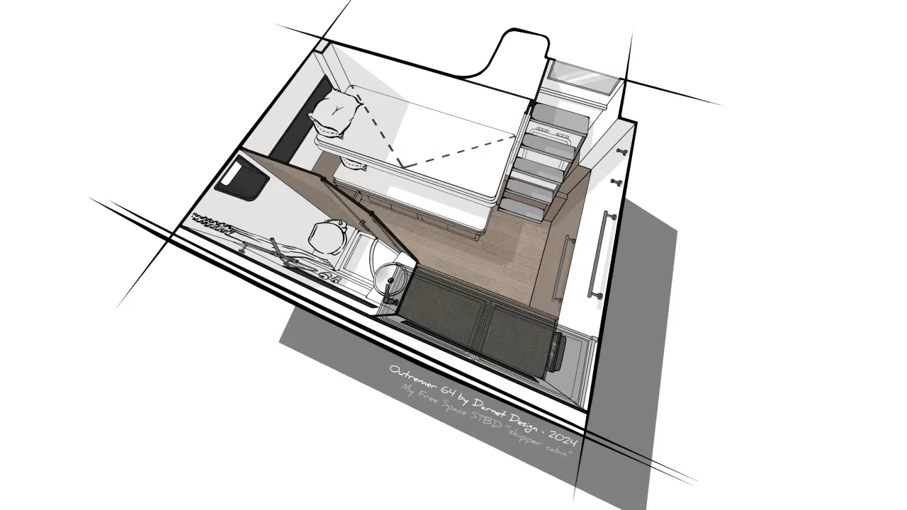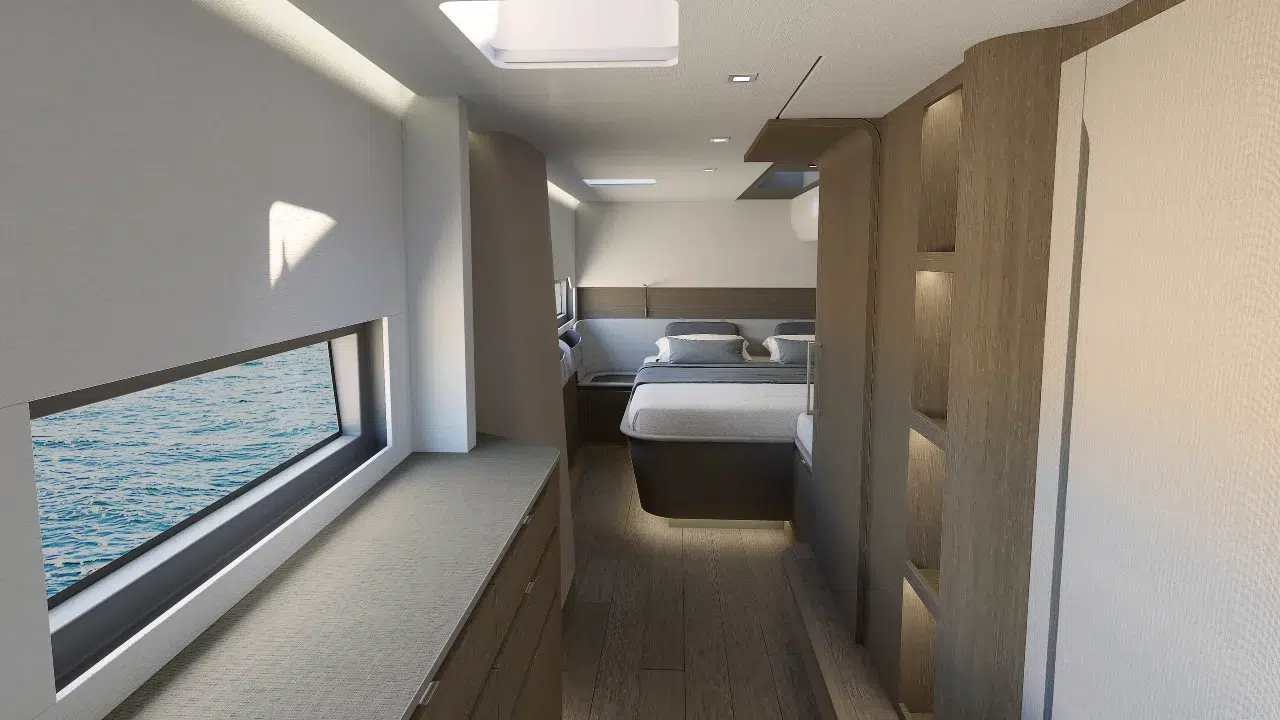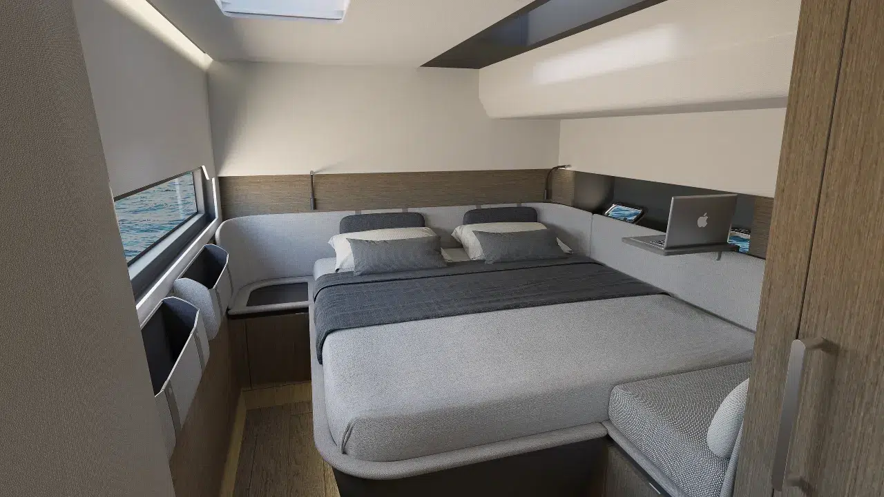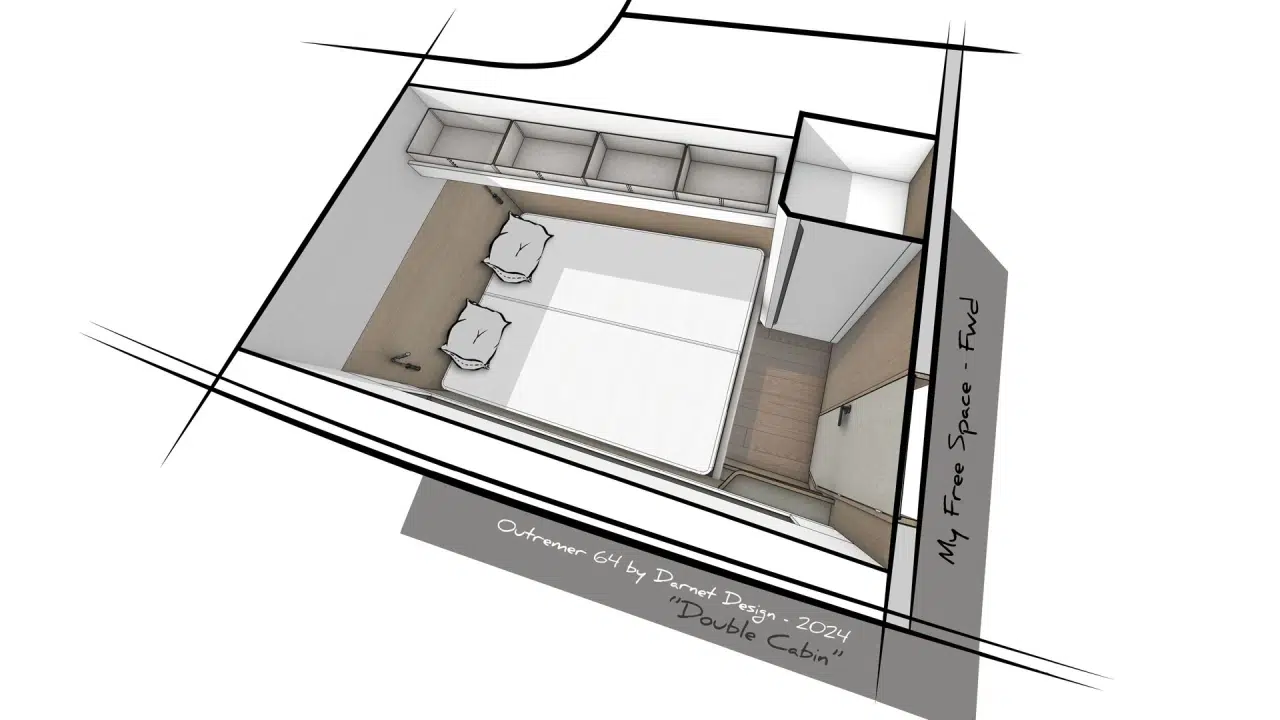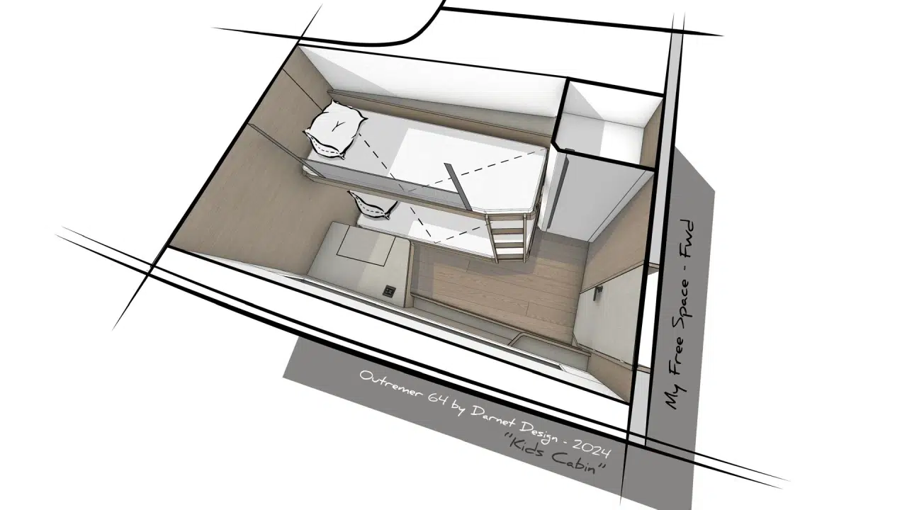 The Outremer 64 is the only catamaran in its range to offer two MyFreeSpace (MFS) areas, a true signature of Outremer’s ingenuity. Each area can be configured in several ways, all of which are fully customisable: office, workshop, children’s area, double berth… up to 4 configurations in the port forward cabin and 3 in the aft starboard area, giving a total of 12 possible combinations. This exceptional modularity allows the boat to be adapted to a wide variety of uses: family life, distance working, professional crew or long voyages. This unprecedented flexibility makes the Outremer 64 a deeply customisable, evolutionary catamaran, designed to last.